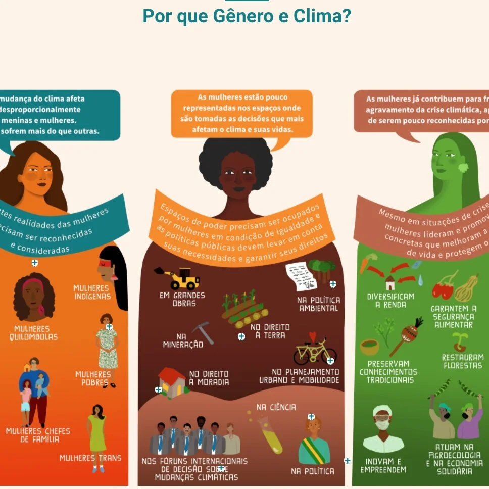 Este infográfico é o resultado da construção coletiva do Grupo de Trabalho em Gênero e Clima do Observatório do Clima. De maneira sucinta e objetiva, apresenta as implicações da mudança do clima para as mulheres e destaca seu papel na ação climática.